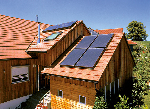 Gewissermaßen das Herzstück einer Solaranlage sind die so genannten Kollektoren. Das Wort kann man mit „Sammler“ übersetzen, was die Aufgabe dieser Bauteile sehr gut umschreibt. In den Kollektoren werden die einfallenden Sonnenstrahlen aufgesogen und in Nutzwärme umgewandelt. Anschließend wird diese Wärme an die durchströmende Wärmeträgerflüssigkeit übergeben und von dieser wiederum über einen Wärmetauscher an das Trink- bzw. Pufferspeicherwasser. Man unterscheidet Kollektoren nach ihrer Bauart in Flach- und Vakuum-Röhrenkollektoren. Flachkollektoren bestehen aus dem Kollektorrahmen, dem Kollektorglas, der Wärmedämmung und dem Absorber. Der Kollektorrahmen wird meistens aus Aluminium gefertigt und ist auf der Rückseite und an den Seiten mit Hartschaum oder Mineralwolle gegen Wärmeverluste gedämmt. Kollektorgläser sollen eine hohe Bruchfestigkeit besitzen, Wärmerückstrahlung verhindern und die einfallenden Sonnenstrahlen gut passieren lassen. Das zuletzt genannte wird durch den niedrigen Eisengehalt in Solarglas erreicht. Im, meist hochselektiv beschichtetem Absorber (z. B. Tinox), findet die eigentliche Umwandlung von Sonnenenergie in Nutzwärme statt. Die Absorber werden außerdem nicht nur nach ihrer Beschichtung unterschieden, sondern auch danach, ob es sich um einzelne Absorberstreifen handelt oder um Vollflächenabsorber. Die am Absorber angebrachten Wärmeträgerrohre werden entweder harfen- oder u-förmig von der Solarflüssigkeit durchflossen. Wobei bei der harfenförmigen Variante der Strömungswiderstand wesentlich geringer ausfällt. Montiert werden Flachkollektoren als Aufdachkollektoren auf Schräg- und Flachdächern oder als Inndachkollektoren direkt in die Dacheindeckung integriert.