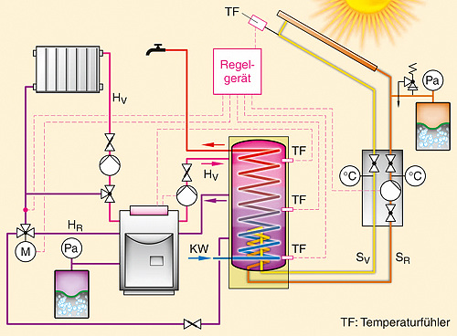 Die Wirkungsweise einer Solaranlage zur Heizungsunterstützung ist prinzipiell mit der einer reinen Trinkwasser-Erwärmungsanlage gleichzusetzen. In den meisten Fällen wird Pufferwasser über einen innen- oder außen liegenden Wärmetauscher erhitzt und dient gleichzeitig als Heizungswasser sowie auch zur Erwärmung des Trinkwassers. Heizungsunterstützende Solaranlagen sind besonders in den Übergangszeiten (Frühjahr/Herbst) und in Systemen, die mit niedrigen Vorlauftemperaturen (z. B. Fußbodenheizungen) betrieben werden, effektiv einsetzbar. Der gebräuchlichste Speichertyp in diesem Bereich, ist der so genannte Duo-Speicher, bei dem eine Trinkwasserblase in einem Pufferspeicher integriert wurde (Speicher-In-Speicher-System). Beim Schichtenspeicher wird das Trinkwasser in einer Edelstahl-Rohrschlange im Durchflussverfahren erwärmt. Der reine Pufferspeicher besitzt einen außen liegenden Wärmetauscher, in dem das Trinkwasser im Durchflussverfahren auf Temperatur gebracht wird. Durch die bereits angesprochene Schichtladung werden die Speicher im oberen Bereich schnell auf ein Temperaturniveau gebracht, welches sowohl für das Trinkwasser wie auch für die Heizung ausreichend ist. Dafür ist es aber notwendig, dass die Vor- und Rücklaufanschlüsse der Heizkreise und des Heizkessels so an den Pufferspeicher angeschlossen werden, dass der Speicher unter Wahrung der Schichtung be- und entladen werden kann.