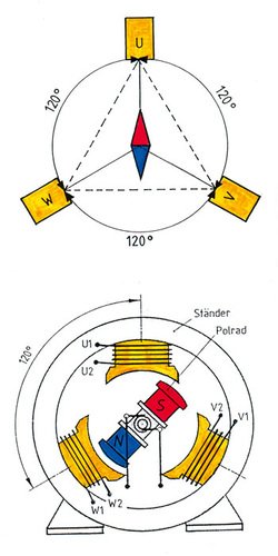 Wer sich abends auf sein Fahrrad schwingt, der wird es nicht versäumen, durch anlegen des Dynamos an das Rad für verkehrssicherndes Licht zu sorgen. Hier wird eine Drehbewegung zu elektrischem Strom. Das passiert auch in einem Kraftwerk. Durch Dampf oder durch Wasserkraft wird eine Turbine in Wallung gebracht, die Leben in einen Drehstromgenerator einhaucht. Ein Drehstromgenerator besteht im einfachsten Fall aus einem ringförmigen Ständer mit drei Wicklungsspulen, die man sich als Ecken eines gleichseitigen Dreiecks vorstellen kann. In der Mitte des Dreiecks dreht sich ein Stabmagnet. Wenn sich der Magnet dreht, erzeugt er in jeder Spule eine Wechselspannung. Auf dem Bildschirm eines Oszillographen hat die Wechselspannung die Form einer Sinuskurve. Die Sinuskurve ergibt sich aus der Drehbewegung, indem jede Spule mal stärker und mal schwächer „in den Genuss“ des Magnetfeldes kommt. Deshalb wird die Spannung mal höher und mal niedriger. Da sich mal der Nord- und mal der Südpol an jeder Spule vorbei dreht, bewegt sich die Spannung mal nach oben und mal nach unten. Die drei Spulen sind gleichmäßig auf dem Kreis verteilt. Vom Mittelpunkt aus gesehen stehen sie in einem Winkel jeweils 120° zu einander. Der Winkel ist ein Drittel des ganzen Kreises. Wenn die Geburtstagstorte in genau drei Teile teilt, kommt man zu demselben Ergebnis. Der ganze Kreis hat einen „Innenwinkel“ von 3 x 120° = 360°. Das Polrad beschreibt bei einer Umdrehung einen Winkel von 360°. Da es sich dabei zwischen den drei Spulen dreht, erzeugt es drei Wechselspannungen. In den drei Spannungskurven (Phasen) des Drehstroms taucht der 120°-Winkel wieder auf. Er ist für den Abstand der einzelnen Kurven voneinander verantwortlich. Den Abstand kann man sich auch als Abwicklung von 120° oder 1/3 Umdrehung vorstellen.