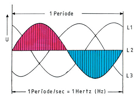 Von dem sich drehenden Magnetfeld hat der Drehstrom etwas irreführend seinen Namen bekommen. Auch bei Gleichstrom- und Einphasenwechselstromgeneratoren dreht sich das Magnetfeld. Wegen der drei ineinander verschobenen Spannungsphasen wird er auch Dreiphasenwechselstrom genannt. Ein großer Drehstromgenerator hat meistens mehrere Polpaare und mehr als drei Spulen, die zu den drei Spulen U, V, W zusammengefasst werden. Jede Spannungskurve hat eine obere und eine untere Halbwelle. Eine Periode besteht aus einer oberen und eine unteren Halbwelle. Die Zahl der Perioden wird als Frequenz bezeichnet und in Hertz (Hz) gemessen. Ein Hertz bedeutet 1 Periode pro Sekunde. Der in Europa übliche Drehstrom hat eine Frequenz von 50 Hz. Es werden also 50 solcher Perioden in jeder Phase durchs Netz geschickt. Dass das Drehstromsystem weltweite Verbreitung gefunden hat, ist vielleicht einer Laune der Geschichte zu verdanken. Anlässlich der Internationalen Elektrizitätsausstellung in Frankfurt im Jahre 1891 wurde Strom von der schwäbischen Kleinstadt Lauffen am Neckar ins 175 km entfernte Frankfurt geschickt. Die aus Wasserkraft gewonnene Elektrizität trieb auf der Ausstellung einen künstlichen Wasserfall an. Zum ersten Mal war es möglich, Elektrizität mit geringen Verlusten über große Entfernungen zu transportieren. Und das erregte nicht nur in der Fachwelt enormes Aufsehen. Die Stromübertragung arbeitete zufällig nach dem beschriebenen Drehstromsystem, das von da an zum Aufbau der Versorgungsnetze verwendet wurde.