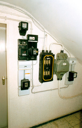 Die elektrische Energie wird über die Hauptleitung zum Hausanschlusskasten geschickt. Hier erfolgt die Aufteilung in mehrere Stromkreise, die untereinander parallel geschaltet sind. Jeder Stromkreis hat seine eigene Sicherung. In Altbauten ist der Hausanschluss durch spätere Erweiterungen oft sehr unübersichtlich. Im Allgemeinen werden alle Steckdosen, Lichtschalter und sonstige Elektogeräte eines Raumes oder Stockwerkes zu einem Stromkreis zusammengefasst. Und dann hat man den Saft da, wo er benötigt wird, um Haus - und natürlich auch die Baustelle - zum Leben zu erwecken.