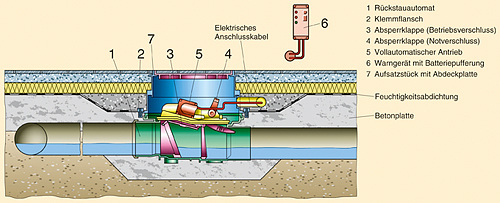 Den sichersten Schutz vor Rückstau bietet eine Abwasserhebeanlage. Ihre Druckleitung wird bis über die Rückstauebene geführt. Ein Eindringen von Abwasser über die Druckleitung ist somit selbst bei Rückstau unmöglich. Daher werden Hebeanlagen als Rückstauschutz immer dort eingesetzt, wo eine Überflutung mit Abwasser erheblichen Schaden verursachen würde, wie z. B. in einer Kellerwohnung. Handelt es sich bei den rückstaugefährdeten Sanitärobjekten um solche, die nicht in „edlen Räumen“ stehen und nur selten genutzt werden, ist ein Rückstauschutz durch Einsatz eines Rückstaudoppelverschlusses realisierbar. Rückstaudoppelverschlüsse sind - wie der Name vermuten lässt - mit zwei Verschlüssen ausgerüstet. Einer der Verschlüsse ist so konstruiert, dass er von Hand zugemacht werden kann (Notverschluss). Es handelt sich dabei um ein Ventil, um eine Klappe oder um einen Schwimmkörper. Der Betriebsverschluss kann ein Schwimmer, eine Klappe oder ein Schlauchquetschventil sein. Rückstaudoppelverschlüsse gibt es für Grauwasser und für Schwarzwasser. Während beim Grauwasserverschluss Pendelklappen durch das rückdrückende Abwasser zugedrückt werden, arbeiten die Schwarzwasserverschlüsse mit motorbetriebenen Klappen oder Schlauchquetschventilen. Schließlich können bei diesen ja auch mal Rückstände (wie Toilettenpapier) im Schließbereich liegen. Die Kraft des Motors sorgt dafür, dass dies nicht zu einer Undichtheit führt. Jedenfalls nicht zu einer, die normativ nicht vorgesehen ist. Nach Norm gilt ein Rückstaudoppelverschluss als „dicht“, wenn im Rückstaufall nicht mehr als 0,5 Liter Abwasser innerhalb von 10 Minuten austreten. Da sich diese Normvorgabe auf eine Stauhöhe von nur 10 cm bezieht, ist die Leckwassermenge umso größer, je tiefer der Verschluss unter der Rückstauebene liegt.