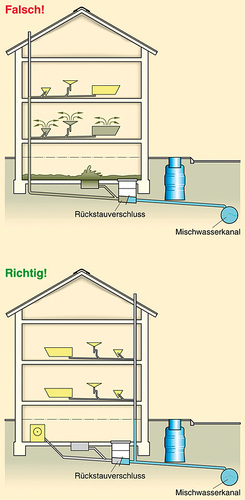Nicht selten passiert es, dass der Rückstauschutz erst dann zum Thema wird, wenn das Kind schon in den Brunnen gefallen ist - nämlich nach dem ersten „Land unter“ im Keller. Oft kommt es danach zu einem folgenschweren Entschluss: Die erste Reinigungsöffnung im Haus, unmittelbar vor Führung der Hauptgrundleitung aus dem Gebäude, wird zum schwarzwassertauglichen Rückstaudoppelverschluss umgebaut. Man glaubt sogar, etwas besonders Gutes getan zu haben, da nun kein „Fremdabwasser“ in die eigene Grundleitung eindringen kann. Kommt es dann zum Rückstau, werden die Klappen des Verschlusses mit Motorkraft zugedrückt. Genau das aber, wird in den Wohnungen des Hauses nicht bemerkt. Hier wird weiter das WC benutzt, geduscht, gespült. Das Abwasser staut sich vor dem Verschluss. Ist die Grundleitung vollgelaufen, tritt es über die Sanitärobjekte im Keller - die ja eigentlich vor Rückstau geschützt werden sollten - aus. Der Keller ist wieder geflutet; schwacher Trost: Es handelt sich diesmal um das eigene Abwasser. Aus dieser Erkenntnis folgt: Rückstauverschlüsse müssen so eingebaut werden, dass sie den Abwasserabfluss von Sanitärobjekten, die nicht rückstaugefährdet sind, nicht unterbinden.