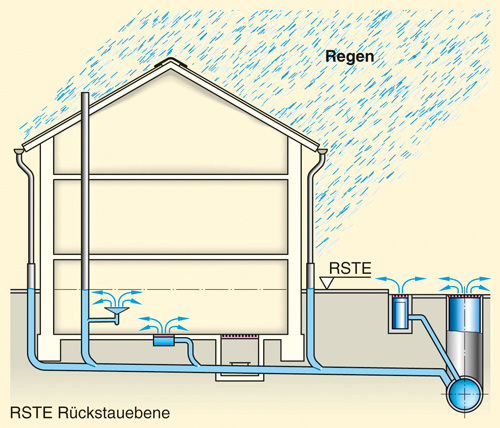 Aufgabe des Straßenkanals ist es, die Abwässer abzuführen. Meistens werden fäkalienhaltiges Abwasser (Schwarzwasser) und fäkalienfreies Abwasser (Grauwasser) zusammen mit dem Regenwasser in einem Kanal transportiert. Man bezeichnet dieses Kanalsystem daher als Mischsystem. Während der Abwasservolumenstrom einigermaßen genau berechnet werden kann, stellt die Antwort auf die Frage nach dem Regenwasservolumenstrom eher einen Kompromiss dar. Würde man bei der Dimensionierung des Kanals von der größten überhaupt denkbaren Regenspende ausgehen, wäre die Rohrleitung für den überwiegenden Teil der Betriebszeit zu groß bemessen. Um das zu vermeiden, geht man daher von einer mittleren Regenspende aus. Dabei nimmt man in Kauf, dass bei einem Starkregenereignis der Kanal mit der Abführung der Niederschlagsmengen überfordert ist und volläuft. Das Wasser staut sich auf und drückt hoch. Nach dem Prinzip der kommunizierenden Röhren steht das Wasser in den am Kanal angeschlossenen Leitungen so hoch, wie im Kanal selbst. Erreicht das Wasser die Kanaldeckel, verteilt es sich auf der Straße. Es kann folglich nicht höher ansteigen. Deshalb bezeichnet man die Straße auch als „Rückstauebene“. Doch Vorsicht: Bei der Klärung der Frage, wie hoch sich das Wasser im Kanal aufstauen kann, muss die Straßenoberkante nicht grundsätzlich die Rückstauebene sein. Sie kann tiefer als die Straßenoberkante liegen, aber auch höher als diese, z. B. in einer Senke. Verlässliche Auskünfte hierzu erteilt der Kanalnetzbetreiber.