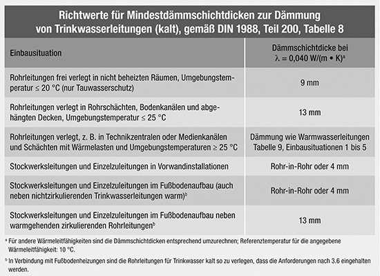 Darüber hinaus fordert die DIN 1988, kaltgehende Trinkwasserleitungen in einem ausreichenden Abstand zu Wärmequellen, wie z. B. warmen Rohrleitungen, zu verlegen. Ist dies nicht möglich, sind die Leitungen so zu dämmen, dass die Wasserqualität durch Erwärmung nicht beeinträchtigt wird. In der Tabelle 8 unter Absatz 14.2.6 nennt die DIN 1988 Richtwerte für Mindestdämmschichtdicken für kalte Trinkwasserleitungen. Die hier festgeschriebenen Dämmschichtdicken beziehen sich auf eine Wärmeleitfähigkeit des Dämmstoffes von 0,040 W/(m×K) bei „üblichen Betriebstemperaturen“ im Wohnungsbau.