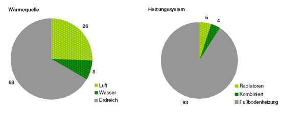 Beim Wärmeverteilsystem ist die Dominanz des bevorzugten Systems für die Wärmepumpen eindeutig: 93 Anlagen (92%) sind mit Fußbodenheizung und nur 5 (4%) mit Radiatoren ausgestattet. Vier Objekte haben kombinierte Systeme. Die beheizte Wohnfläche der Objekte erstreckt sich von 120 bis 350 m². Der durchschnittliche Wert liegt bei 194 m². Jeder Teilnehmer des Projektes erhielt einen Fragebogen mit Fragen zum Haus und zur Haustechnik. Unter anderem wurde auch der Jahresheizwärmebedarf abgefragt, wobei lediglich 37 Teilnehmer Angaben dazu machten. Der Mittelwert liegt bei 57 kWh/m²a.