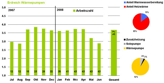 Der Mittelwert für die erfassten Arbeitszahlen der Sole-Wasser-Wärmepumpenanlagen liegt im Zeitraum zwischen Juli 2007 und Juni 2008 bei 3.7. Die Anlagen sorgen sowohl für die Bereitstellung der Heizwärme als auch für die Erwärmung des Brauchwassers. Für den reinen Heizbetrieb der Wärmepumpenanlagen liegt der Mittelwert der Arbeitszahlen bei 4.1. Bei fünf Anlagen handelt es sich um Kompaktgeräte, bei denen die Messung der erzeugten Energie ohne die Speicherverluste nicht möglich ist. Diese Anlagen beeinflussen jedoch den Mittelwert der Gesamtarbeitzahlen nicht negativ. Die elektrische Zusatzheizung (z. B. Heizstab) wird bei der Berechnung der Arbeitszahlen berücksichtigt. Die Arbeitszahlen (bei gemischtem Betrieb) variieren für die einzelnen Anlagen zwischen 2.9 und 4.5.