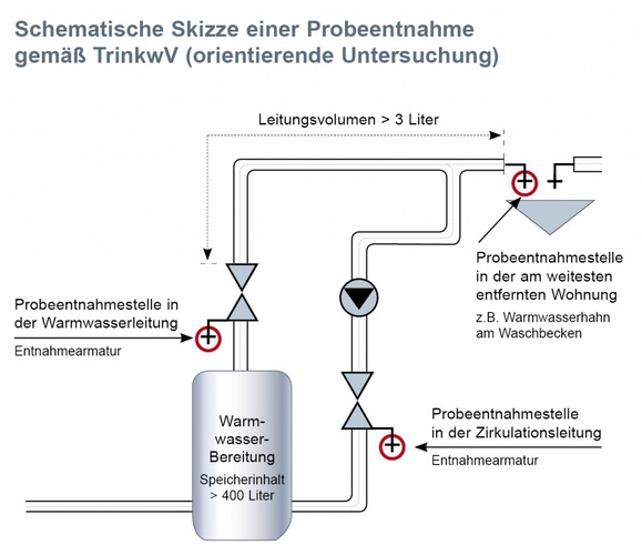 „Verwalter sollten die Trinkwasseranlage gemeinsam mit ihrem Fachhandwerker überprüfen und für eine reibungslose Probeentnahme vorbereiten“, rät Matthias Bär. Die Legionellengefahr ist ohnehin sehr gering, wenn die Anlage nach den allgemein anerkannten Regeln der Technik installiert und betrieben wird. Insbesondere sind Temperaturen einzuhalten und stehende Leitungsabschnitte zu vermeiden. Bei der Bestandsaufnahme sollten deshalb die Anzahl der Steigstränge, ebenso Betriebsparameter, Stagnationsstrecken oder Totstrecken erfasst werden. Offensichtliche Missstände, etwa zu niedrige Temperaturen, sollten vor der Probeentnahme beseitigt werden. Laut TrinkwV dürfen nur akkreditierte Stellen – Listen führen die Gesundheitsämter – Trinkwasserproben an mindestens drei Stellen der Warmwasseranlage entnehmen: in der Warmwasserleitung (Vorlauf) kurz nach dem Warmwasserspeicher, in der Zirkulationsleitung (Rücklauf) kurz vor dem Warmwasserspeicher, und an der Zapfstelle in der Wohnung, die vom Speicher am weitesten entfernt ist. Der Betreiber muss dafür sorgen, dass an diesen Stellen passende Entnahmestellen vorhanden sind. „Das heißt, bis zu zwei Entnahmearmaturen, im Vorlauf und im Rücklauf, sind nachträglich einzubauen. Die dritte Stelle in der Wohnung, zum Beispiel ein Wasserhahn im Bad, ist immer vorhanden“, erklärt Matthias Bär. Vor der Beprobung werden die Entnahmstellen mit Hilfe einer Flamme desinfiziert. Deshalb dürfen sie keine entflammbaren Komponenten wie zum Beispiel nicht abnehmbare Gummidichtungen enthalten.