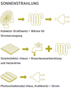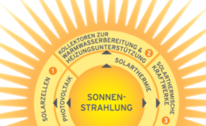 Die Sonne sendet täglich 960 Billionen Kilowattstunden Energie auf die Erdoberfläche. Diese Energiemenge könnte den Weltenergiebedarf theoretisch 180 Jahre lang decken. Sonnenenergie ist eine nahezu unerschöpfliche Quelle, die noch geschätzte vier Milliarden Jahre zur Verfügung steht. Derzeit gibt es drei unterschiedliche Prinzipien, um Sonnenenergie zu nutzen: Solarthermie wird für die Unterstützung von Raumheizung und zur Brauchwassererwärmung verwendet. Zudem wird Solarthermie zur Erzeugung von Strom und