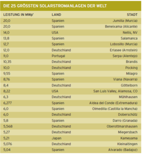 Prozesswärme genutzt. Durch die Erhitzung von Flüssigkeiten werden Dampfturbinen angetrieben, die Prozesswärme liefern und über Generatoren Strom erzeugen. Die Photovoltaik wird zur direkten Stromerzeugung eingesetzt. Deutschland ist bei der Nutzung von Sonnenenergie – auch dank hoher Subventionen – die weltweite Nummer eins. 2007 wurden in Deutschland 3,5 Terawattstunden