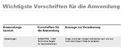 Nach den TRGI 2008 wird für Gasleitungen, deren Rohrverbindungen im Brandfall nicht längskraftschlüssig sind, eine Befestigung mittels Rohrschellen aus nichtbrennbarem Material und mit Metalldübeln gefordert. Die Installation hat dabei an Gebäudeteilen, die einem Brand mindestens 90 Minuten - in Gebäuden mit geringer Höhe mindestens 30 Minuten - standhalten, zu erfolgen. Diese Befestigung ist z.B. bei hartgelöteten Kupferleitungen oder im Bereich von Glattrohrverbindern in Stahlleitungen erforderlich. Bei Gasleitungen mit auch unter thermischer Belastung längskraftschlüssigen Verbindungen (z.B. Gewinde- oder Schweißverbindungen an Stahlrohren) kann gemäß den TRGI auf den Einsatz von Metalldübeln verzichtet werden. Hierbei sollte aber immer sichergestellt sein, daß die Leitung niemals vollständig abstürzen kann (z.B. gewährleistet durch Wanddurchführungen).