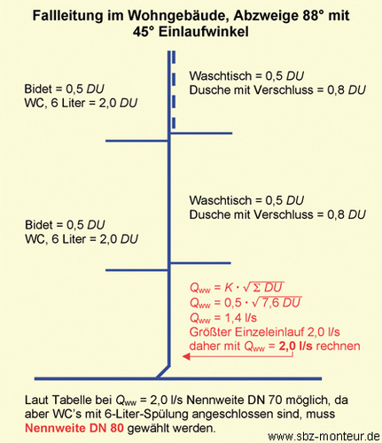 Wie viel Wasser die Fallleitung abtransportieren muss, wird unter Berücksichtigung der Gebäudeart, also der Wahrscheinlichkeit einer gleichzeitigen Benutzung der angeschlossenen Sanitärobjekte, ermittelt. Genauso wie auch für die Teilstücke von Grund- und Sammelleitungen, wird aus der Summe der DU der angeschlossenen Sanitärobjekte mit der Abflusskennzahl K der Schmutzwasserabfluss Qww errechnet. Anders als bei den liegenden Leitungen ist eine Fallleitung aber als nur ein Teilstück zu betrachten. Sie muss schließlich durchgängig in einer Nennweite installiert werden. Steht Qww fest, kann aus einer Tabelle die nötige Mindestnennweite der Fallleitung abgelesen werden. Man muss nur darauf achten, die richtige Tabellenspalte zu erwischen. Denn neben der für Fallleitungen mit Hauptlüftung, gibt es auch noch eine für Fallleitungen mit Nebenlüftung. Sie wird benutzt, wenn die Fallleitung neben ihrer Hauptlüftung noch eine zweite, nur Luft führende Leitung als direkte oder indirekte Nebenlüftung besitzt. Während an einer Fallleitung in DN 80 nicht mehr als vier Küchen angeschlossen werden dürfen (Fettablagerung!), muss eine Fallleitung mit WC-Anschluss nicht mehr mindestens in DN 100 ausgeführt werden. Arbeiten die WC’s mit 4-Liter-Spülungen oder mit 6-Liter-Spülungen, reicht DN 80 als Nennweite aus. Neu ist die Möglichkeit, Fallleitungen auch in DN 60 auszuführen. Die nur geringen Schmutzwassermengen, die über eine solche Leitung abgeführt werden können, machen diese Nennweite für Fallleitungen aber zum Ausnahmefall.