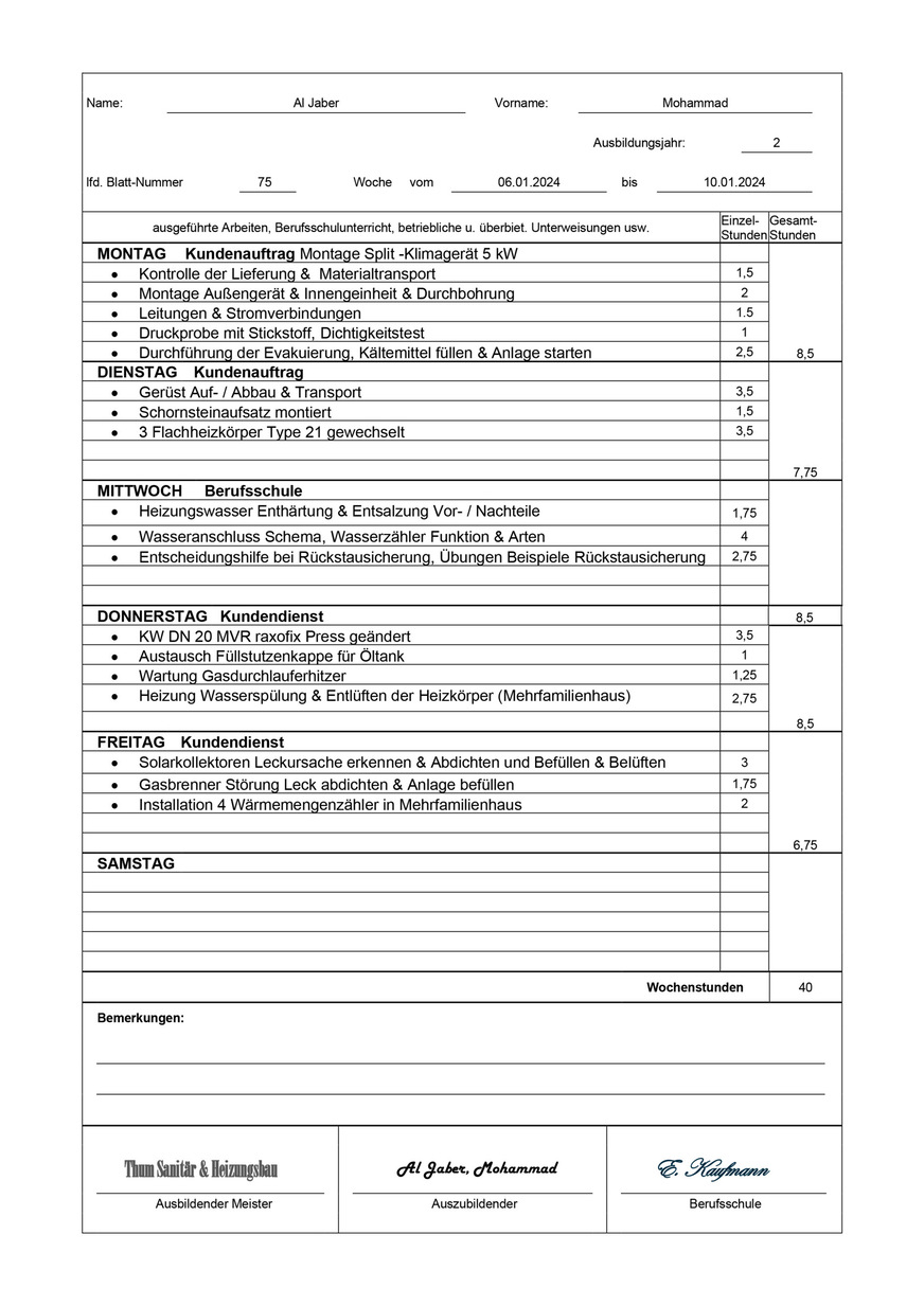 Bericht Heizung, Wochenbericht