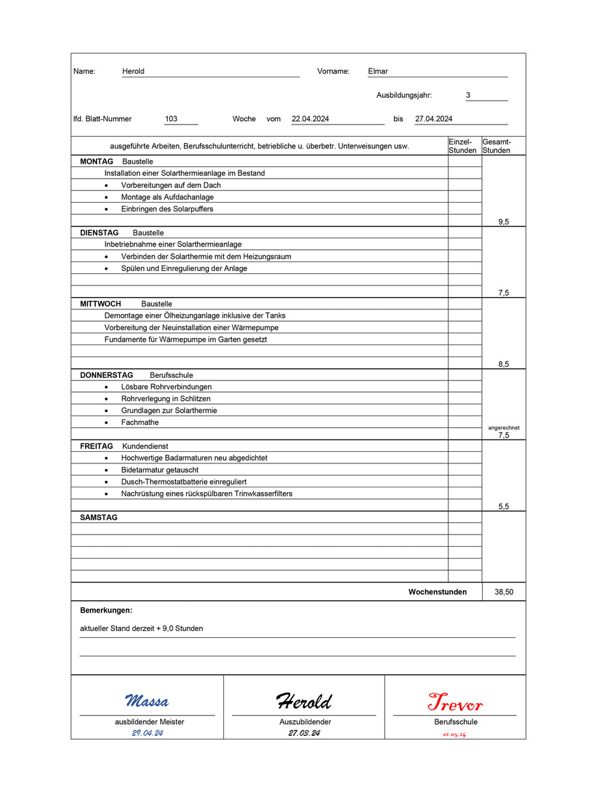 Bericht Sanitärtechnik / Heizungstechnik, Wochenbericht