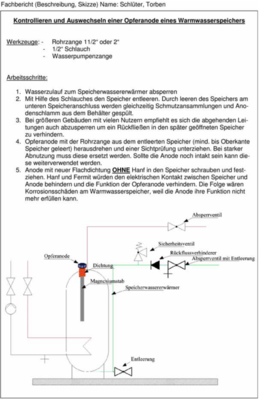 Die Magnesium-Anode gibt die freiliegenden positiv geladenen Elektronen durch das stromleitende Trinkwasser ab. Diese wandern wie von einem Wahn getrieben, aber eigentlich gemäß ihrer elektrischen Ladung zur Kathode. Und die ist die entsprechende Gegenstelle dieser Ladung, also die Fehlstelle. Würde man zwischen Opferanode und Trinkwasserbehälter die elektrische Spannung messen, würde ein entsprechend empfindliches Gerät dies anzeigen. Der so geschützte Trinkwassererwärmer verhält sich also wie eine Batterie. Als schöner Nebeneffekt kann dabei noch angesehen werden, dass bei Wasser mit einer ordentlichen Menge an Calciumcarbonat die Fehlstelle im Email langsam mit diesem umgangssprachlichen Kalk zuwächst.