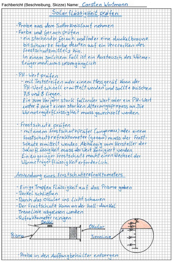 Solarflüssigkeit altert – Die Alterungserscheinungen werden beschleunigt durch Sauerstoffeintrag und Stagnation. Als Stagnation bezeichnet man den Zustand in einer Solaranlage, der die Solarpumpe bei Erreichen einer kritischen Kollektortemperatur, meistens um die 130°C vom Solarregler abgeschaltet wird. Folglich findet kein Wärmeaustausch zwischen Kollektor und Speicher mehr statt. Die Solarflüssigkeit stagniert, die Kollektortemperatur steigt, die Solarflüssigkeit beginnt zu sieden und anschließend zu verdampfen. Durch die hohen Temperaturen, im Kollektor (Röhre) kann es schon mal lauschige 300°C heiß werden. Unter diesen Bedingungen „vercrackt“ die Solarflüssigkeit, d.h. die Molekülketten des Glykols werden aufgesprengt, die Rückstände sind meist Teerförmige klebrige Klumpen. Eine Reinigung der Solaranlage ist meist sehr aufwendig und wird mit Spezialreinigern durchgeführt.