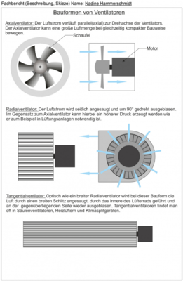 Die einfachste Bauform eines Ventilators ist der Walzenlüfter auch Tangentialventilator genannt. Diese Bauform findet man meistens in Heizlüftern und Säulengebläse. Daneben hat Nadine Hammerschmidt noch einige andere Ventilatoren gefunden.