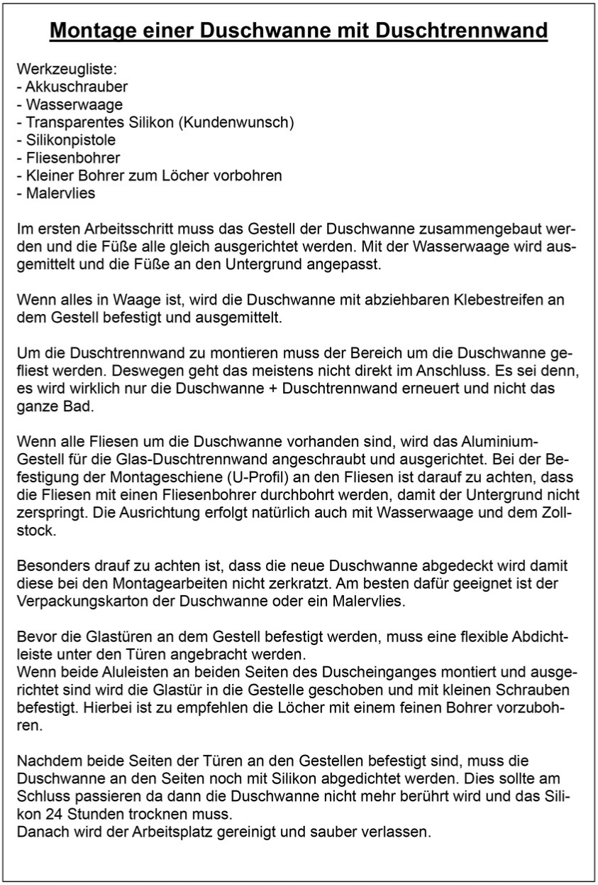 Eine Duschtrennwand aufzustellen gehört sicherlich zu den anspruchsvolleren Aufgaben des Anlagenmechanikers. Meistens sind die Abtrennungen teure Maßanfertigungen aus Glas die dem Bad etwas Elegantes verleihen sollen. Doch schon beim Transport kann so einiges schiefgehen. Deshalb sollten in der Firmenkutsche auch Befestigungssysteme verbaut sein die das sichere Transportieren garantieren. Auch Tragehilfen für glatte Fensterscheiben erlauben den sicheren Transport der empfindlichen Ware.
