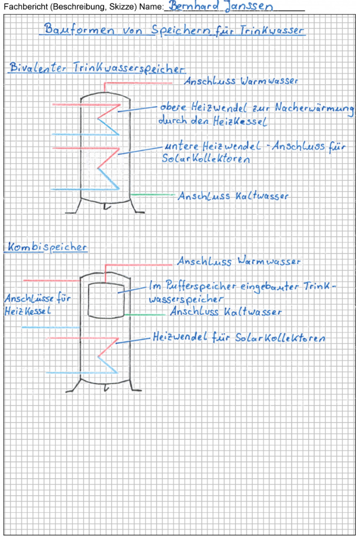 Bivalente Speicher benötigt man um zwei unterschiedliche Wärmequellen, daher auch das „Bi“ im Namen in einen Heizungssystem zu nutzen. Bsp.: Solare Strahlungsenergie erwärmt das TW, das Gas-Brennwertgerät heizt bei fehlender solarer Energie nach. Ein Kombispeicher wird immer dort eingesetzt um z.b. die solare Wärmeenergie auch zur Unterstützung der Heizungsanlage zu verwenden.
