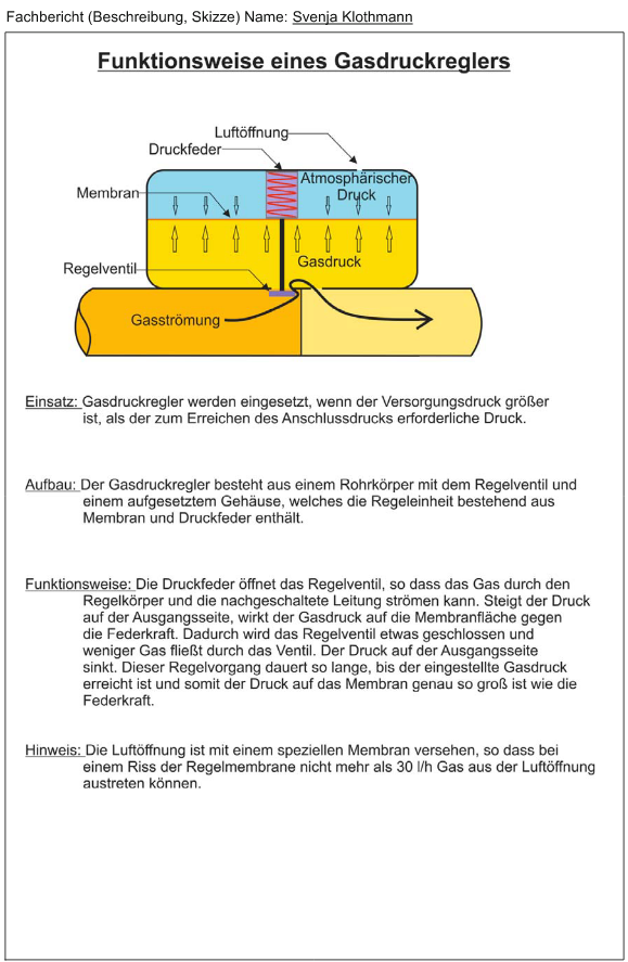 Gasdruckregler finden immer dann ihre Anwendung wenn der Gasversorgungsdruck zu groß für die direkte Anwendung ist. Sie werden innerhalb eines Gebäudes hinter der HAE (Hauptabsperreinrichtung) verbaut. Der Gasdruckregler regelt den Gasdruck auf den gewünschten Anschlussdruck hinunter und hält ihn konstant. Schließlich führen schwankende Drücke an den Brennerdüsen der Gasgeräte zu unregelmäßiger Wärmeerzeugung, die hohe Emissionen (CO) zur Folge hat. Der Gasdruckregler sorgt dafür, dass zu hohe Vordrücke gemindert werden und ein konstanter Reglerausgangsdruck erzielt wird. Ein Gasdruckregler besteht aus einer Membrane (auf der einen Seite wirkt das Gas, auf der anderen wirkt der atmosphärische Druck), einer in einer Hülse steckenden Druckfeder und dem Regelventil. Fällt der Gasdruck ab, bewegt sich die Membrane mit dem Regelventil nach unten, wodurch die Ventilöffnung größer wird und mehr Gas durchströmen kann. Durch den ansteigenden Gasdruck geht die Membrane mit dem Regelventil wieder etwas nach oben. So entsteht ein Wechselspiel, bis ein konstanter Gasdruck erreicht ist.