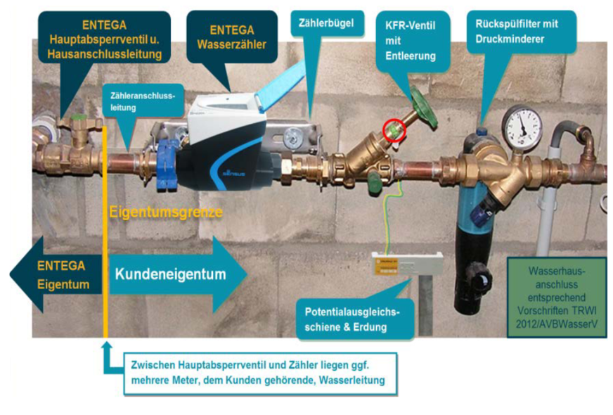 Der Wasserzähleranschluss-Platz muss zudem Frostfrei und leicht zugänglich sein. Der Wasserzählerbügel stellt den Potentialausgleich sicher. Selbstverständlich muss die metallene Wasserleitung über eine Potentialausgleichsschiene geerdet werden. So kann der Wasserversorger den alten Zähler gefahrenfrei ausbauen.