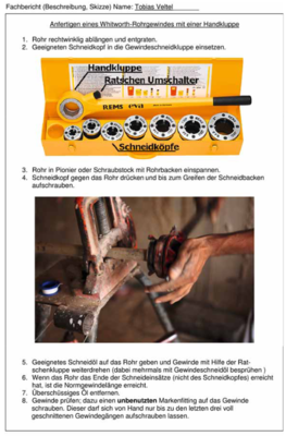 Der Fachbericht erklärt schlüssig wie man ein Withworth-Rohrgewinde herstellt. Doch nicht auf jedes Stahlrohr kann ein Gewinde geschnitten werden. Gewinderohre werden in der Haustechnik heute zur Erstellung von Gasleitungen oder Feuerlöschleitungen eingesetzt. Um eine Verbindung Gewinderohr – Fitting herstellen zu können, muss auf das Rohr ein Gewinde geschnitten werden. Dieses besondere Gewinde wird Whitworth-Rohrgewinde (nach DIN EN 10266) genannt. Das Gewinde wird mit Hilfe einer Kluppe mit der Hand oder mit einer maschinellen Kluppe geschnitten. Das Besondere dieses Gewindes ist seine Form. Das Außengewinde ist kegelig (Kennbuchstabe: R). Der Fitting hat ein zylindrisches Innengewinde (Kurzzeichen: Rp). Die auf das im vorderen Bereich des Außengewindes aufzutragenden Dichtmittel (Hanf, Teflonband oder Dichtfaden) sorgen lediglich dafür, dass Unebenheiten im Gewinde ausgeglichen werden. Der Fitting ist so auf das Rohr zu verschrauben, dass eine metallische Verpressung erfolgt. Aufgrund dieser metallischen Verpressung zählt die Gewindeverbindung zu den unlösbaren Verbindungen. Nach einer Demontage kann das vorhandene Gewinde nicht noch einmal benutzt, sondern muss stattdessen neu geschnitten werden. Das gilt auch für den gebrauchten Fitting. Seine neue Heimat ist die Schrottkiste.