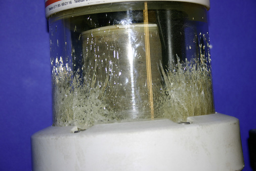 Immer wieder erreichen das IFS Schäden, bei denen Filtertassen von Feinfiltern zerborsten sind. Solche Schäden beginnen mit ersten kleinen Rissen, die dann immer mehr und immer größer werden. Schließlich versagt die Filtertasse und ein Leitungswasserschaden tritt ein. Deshalb wird geraten, bei der Rückspülung der Filter die Filtertasse sorgfältig in Augenschein zu nehmen. Je nach Hersteller sollte das alle zwei bis sechs Monate geschehen. Sind sichtbare Schäden vorhanden, muss die Filtertasse sofort gewechselt werden. Die Bilder 4 und 5 zeigen defekte Filtertassen, die jeweils zu einem größeren Leitungswasserschaden geführt haben. Filtertassen aus Kunststoff sind mechanisch empfindlich. Sie müssen vorsichtig nach Herstellervorgaben behandelt werden. Das gilt dann auch bei der Wartung. Wird hier unsachgemäß rohe Gewalt bei der Verschraubung angewandt, kann das Schäden verursachen. In Bild 5 ist dafür ein Beispiel dargestellt.