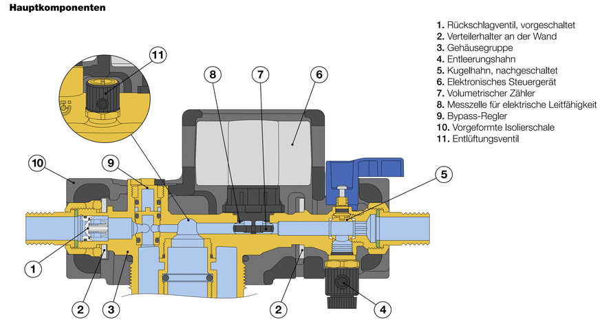 Heizungswasser muss in aller Regel für den reibungslosen und sicheren Betrieb von geschlossenen Heizungsanlagen aufbereitet werden. Mit der neuen Enthärtungs- und Entsalzungseinheit hat Caleffi eine technische Lösung entwickelt, mit der sich beide Methoden der Wasseraufbereitung - Enthärtung oder Demineralisierung (Entsalzung) - realisieren lassen. Die neue Armatur zur Heizungswasseraufbereitung von Caleffi wird diesen Anforderungen durch ihre technische Ausprägung gerecht. Der Grundkörper besteht aus Messing. Darin untergebracht sind ein Volumenmessgerät mit integrierter Messzelle für elektrische Leitfähigkeit, ein Bypass-Regler, ein nachgeschalteter Kugelhahn, KFE-Hahn, Entlüftungsventil und zwei seitlich am Gehäuse angeschraubte 1/4”-Verschlüsse. Dazu gehören Kartuschen zur Durchführung der Enthärtungs- oder Demineralisierungsbehandlung.
