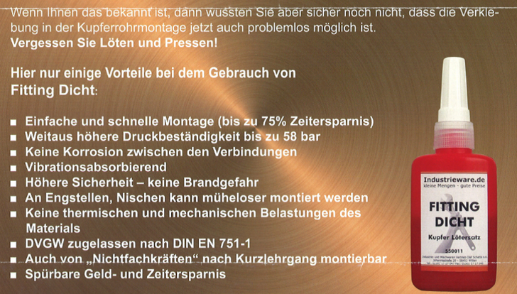 Dieses innovative Produkt wurde mir auf der SHK-Messe angeboten. Da kann man nur vor warnen, also lasst eure Finger von diesem Produkt, selbst dann wenn hier mit einem DVGW-Prüfkennzeichen geworben wird.