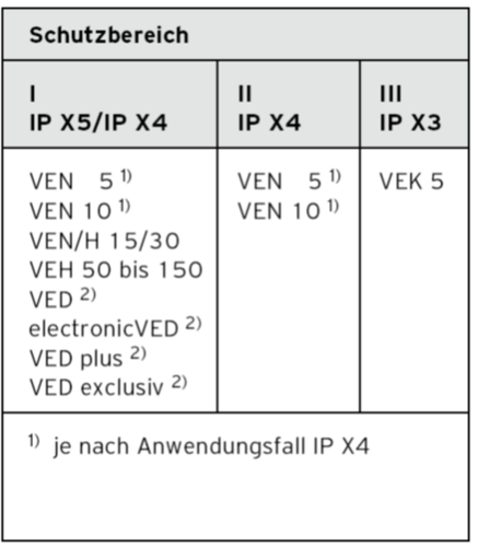 1) Die Schutzart IP X5 muss gewählt werden, wenn mit dem Auftreten von Strahlwasser zu rechnen ist, z. B. Massage-Duschen.
