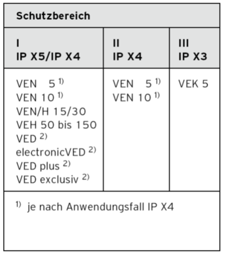 1) Die Schutzart IP X5 muss gewählt werden, wenn mit dem Auftreten von Strahlwasser zu rechnen ist, z. B. Massage-Duschen.