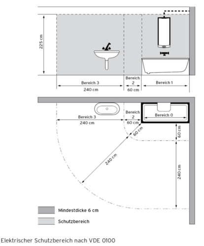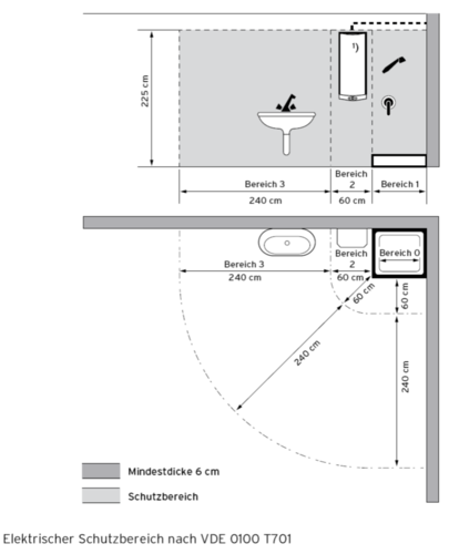 Schutzbereiche für Duschbäder Achtung! Eventuell mit Strahlwasser rechnen!