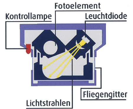Für den häuslichen Bereich sind optische 9-Volt-Rauchmelder die ideale Lösung. Diese sind einfach zu installieren und müssen nicht verkabelt werden. Sie arbeiten unabhängig von der örtlichen Stromversorgung und sind überall im Fachhandel erhältlich. Beim Kauf eines solchen Rauchmelders sollte aber unbedingt darauf geachtet werden, dass er das VdS-Siegel besitzt und nach DIN 14604 [1] geprüft ist. Idealer Weise verfügt er dann auch noch über Langzeitbatterien (9 V Lithium). Diese verfügen über eine Batterie-Lebensdauer von bis zu zehn Jahren. Und nach dieser Laufzeit muss der Rauchmelder ebenfalls ausgetauscht werden (Herstellerangaben beachten). Die Sensoren eines optischen Rauchmelders arbeiten - wie der Name schon vermuten lässt - nach dem optischen Prinzip, d. h. in der Messkammer des Gerätes werden regelmäßig Lichtstrahlen ausgesendet, die im Normalzustand nicht auf die Fotolinse treffen. Tritt Rauch in die Messkammer ein werden die ausgesendeten Lichtstrahlen durch die Rauchpartikel gestreut und auf das Fotoelement gelenkt. Der Rauchmelder löst aus.