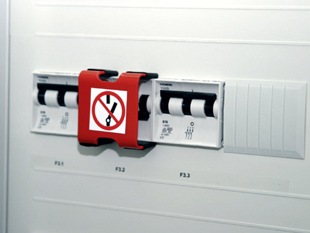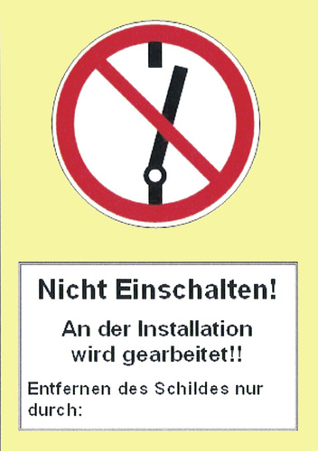 Gegen Wiedereinschalten sichern heißt sicherzustellen, dass niemand anderes den Stromkreis wieder in Betrieb nimmt, während man selbst noch Arbeiten daran ausführt. Dies kann auf verschiedene Arten realisiert werden. Liegt z. B. eine verschließbare Elektroverteilung vor, sollte nach dem Abschalten der Sicherung der Schrank verschlossen werden. Außen ist dann eine Warntafel anzubringen, die vor dem Wiedereinschalten der Sicherungen warnt. Die Tafel darf auch nur von dem entfernt werden, der die Arbeiten ausführt. Selbstverständlich sollte natürlich sein, dass man den Schlüssel der Unterverteilung dann mitnimmt. Ist ein Verschließen der Verteilung nicht möglich, hält die Industrie Sicherungsmittel wie Sperrelemente bereit, die über den abgeschalteten Sicherungsautomaten geklickt werden können. Aber auch dann ist die Warntafel sinnvoll, die vor dem Wiedereinschalten warnt. Denn allgemein gilt: Lieber eine Maßnahme zu viel ergreifen, als im Nachhinein durch einen Stromschlag von der Leiter zu fallen.