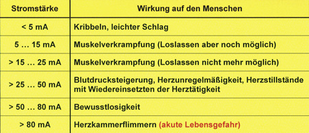 Satte 230 mA haben den verhinderten Lampenmonteur hier durchzuckt. Schon 80 mA können einen Herzstillstand verursachen. Ein Durchströmungsunfall unter diesen Voraussetzungen wird, wenn nicht schnellstmöglich eine wirksame Erste Hilfe erfolgt, tödlich verlaufen. Allein unter diesem düsteren Gesichtspunkt sollte man also dem ach so unscheinbar aus der Wand hervorschauenden Draht Respekt entgegenbringen und die fünf Sicherheitsregeln beherzigen.