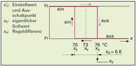 Ein unstetiger Regler in der Haustechnik ist z. B. die bereits genannte Raumtemperaturregelung oder analog dazu auch die Kesselkreisregelung. Genauer gesagt sind diese Regelungen Zweipunktregler, denn ein solcher Regler kennt nur zwei Schaltzustände, nämlich EIN und AUS. Ist der Einschaltpunkt Xe erreicht, schaltet der Regler EIN. Die Einschaltphase dauert nun so lange, bis der Ausschaltpunkt Xa erreicht ist. Der Regler schaltet nun AUS. Wird nach einiger Zeit wieder eine Temperatur, die dem Einschaltpunkt entspricht erreicht, beginnt der Regelablauf von neuem. Die Differenz zwischen Einschalt- und Ausschaltpunkt nennt man auch Schalthysterese. Diese sorgt dafür, dass der Regler nicht unkontrolliert EIN und AUS schaltet, quasi flimmert.
