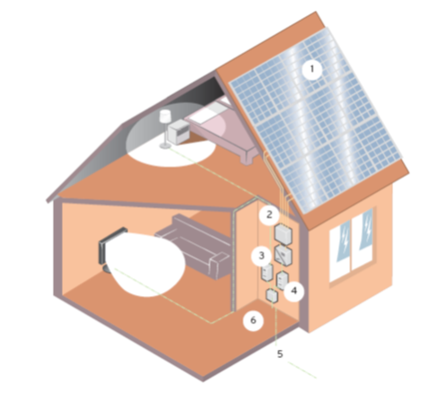 und dem zur Verfügung stehenden Finanzbudget ab. Eine Photovoltaikanlage besteht im Wesentlichen aus den im Bild dargestellten Komponenten: