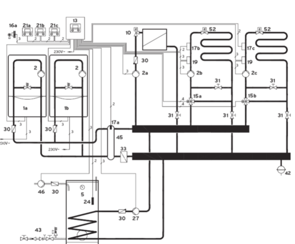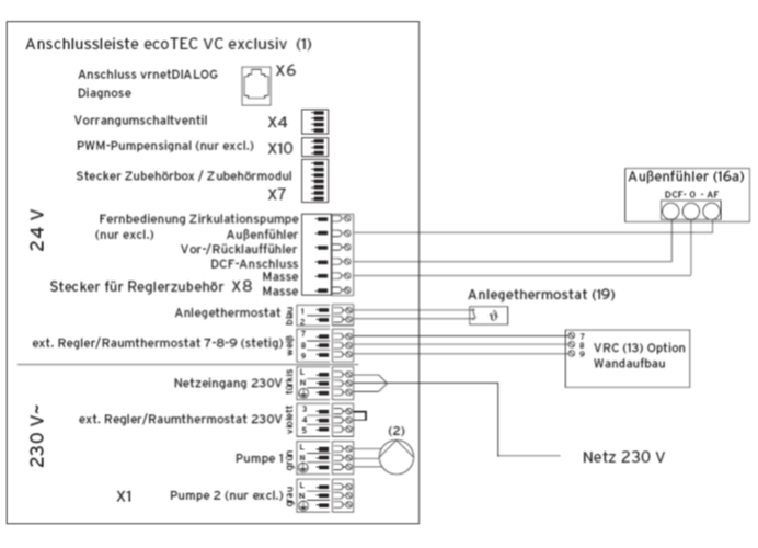Ein Anlegethermostat, oder auch Maximalthermostat muss beim überschreiten einer festgelegten Temperatur den betreffenden Heizkreis außer Betrieb nehmen. Dies geschieht in der Regel direkt durch das abschalten der Heizungspumpe des Kreises (siehe Grafik Hydraulik Bauteil 19 auf 2b / 2c). Der Thermostat kann aber auch über den sog. Alarmkontakt (Anl.Th.) am Wärmeerzeuger direkt angschlossen werden (siehe Grafik). Bei Fußbodenheizungssystemen stellt man den Thermostaten ca. 10K über Auslegetemperatur ein.