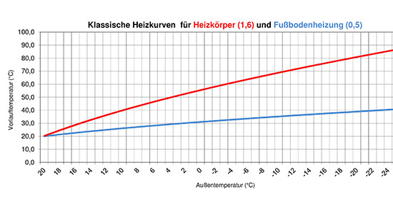 Die Nummerierung der Heizkurven erfolgt nach einem logischen Rechenschema. Anhand eines Beispiels kann man dieses Schema leicht erkennen. Geht man davon aus, dass ein Raum auf 22 °C erwärmt werden soll, und der dort verbaute Heizkörper für eine Vorlauftemperatur von 70 °C ausgelegt wurde bei einer tiefsten Außentemperatur von minus 12 °C dann gilt: