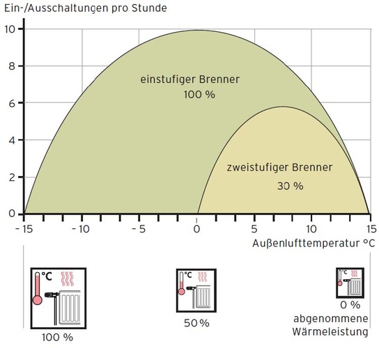 Ein 2-stufiger Ölbrenner stellt sich besser auf den jeweils benötigten Wärmebedarf ein. Besonders in den Übergangszeiten im Frühjahr und Herbst benötigen Heizkessel in unseren Breiten nur ca. 50 % ihrer Leistung; der Brenner