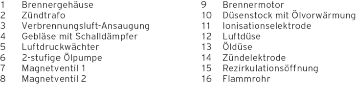 Nach Erreichen der Startdrehzahl (ca. 60 % der maximalen Drehzahl) wird der Zündtrafo (2) eingeschaltet und das Magnetventil 1 für die erste Stufe geöffnet. Die Heizölzufuhr wird freigegeben und es erfolgt die Flammenbildung, indem das über die Düse einströmende Öl mit Hilfe der Zündelektroden gezündet wird. Das Heizöl tritt unter hohem Druck aus der Öldüse (13) aus und wird zerstäubt. Die Verbrennungsluft wird vom Gebläse (4) durch die Luftdüse (12) gefördert und mit dem Ölnebel vermischt. Es ensteht ein zündfähiges Gemisch. Das Gemisch wird vom Zündfunken an den Zündelektroden (14) entzündet. Im Flammrohr (16) bildet sich eine Flamme. Die Ionisationselektrode (11) er fasst den Überwachungsstrom der Flamme, so dass die Elektronik die Flammenerkennung melden kann. Nach Ablauf einer Stabilisierungszeit wird bei entsprechendem Wärmebedarf das Magnetventil 2 (8) für die 2. Stufe geschaltet. Gleichzeitig liefert das Gebläse entsprechend der Nennleistung mehr Verbrennungsluft.