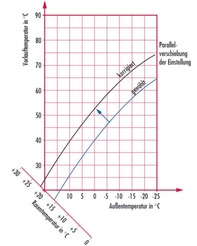 Die Heizkurve wird dadurch parallel verschoben. Der Außentemperatur wird eine höhere Vorlauftemperatur zugeordnet, und die gewünschte Raumtemperatur von 21°C wird erreicht.