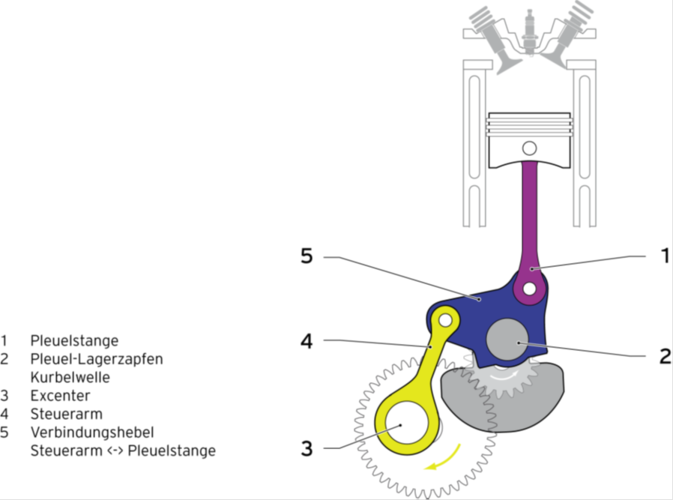 Verbrennung, gleichmäßiger an die Kurbelwelle übertragen. Konstruktiv wird dies durch einen „Knickpleuel“ realisiert. Der Motor wird weniger belastet, hat einen geringeren Verbrauch und damit weniger Schadstoffemission, um seine Leistung zu entfalten.