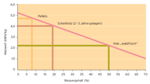 Die fertigen Holzscheite werden – je nach Wetterlage und Jahreszeit – ca. 2 Jahre getrocknet (Wassergehalt unter 20 %!). Waldfrisches Holz hat einen Wassergehalt von 40 – 60 %, lufttrockenes Holz sollte bei ca. 15 – 20 % liegen. Der Heizwert von mehrere Jahre getrocknetem Holz ist etwa doppelt so hoch wie der von waldfrischem Holz, da für die Verdampfung des Wassers bei der Verbrennung Wärme aufgewendet werden muss. Die Verbrennung von feuchtem Holz ist also nicht nur unwirtschaftlich, sie führt auch zu niedrigeren Verbrennungstemperaturen und damit verbunden zu höheren Schadstoffemissionen und Teerablagerungen.
