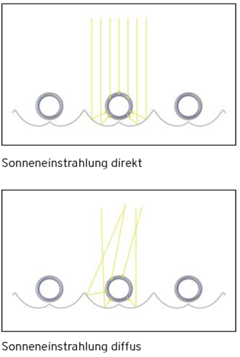 Die Verteil- bzw. Sammelleitung befinden sich oberhalb der Röhren im wärmegedämmten Sammelkasten. Hohe Temperaturdifferenz