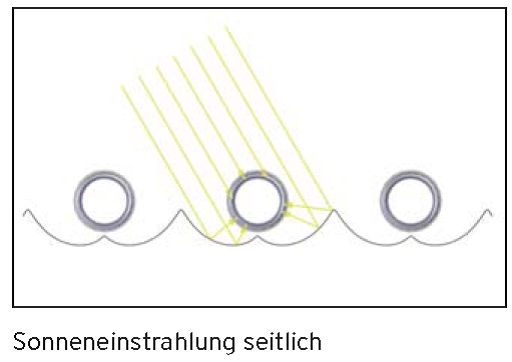 Diese hochreflektierenden, witterungsbeständigen CPC-Spiegel (Compound Parabolic Concentrator) ermöglichen eine optimale Ausnutzung der gesamten auf den Kollektor auftretenden Strahlungsenergie. Über den CPC-Spiegel des Kollektors wird das Sonnenlicht konzentriert und auf die Glasröhren übertragen. Über die Absorberschicht der Kollektoren wird das Sonnenlicht absorbiert und in Wärme umgewandelt. Diese Wärme wird dann an das Wärmeleitblech