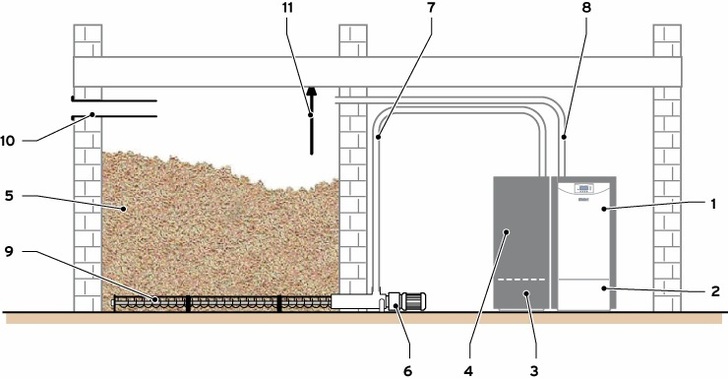 1 - Pellet-Heizkessel 2 - Asche- und Flugaschebehälter 3 - Saugturbine 4 - Zwischenbehälter 5 - Pelletlagerraum