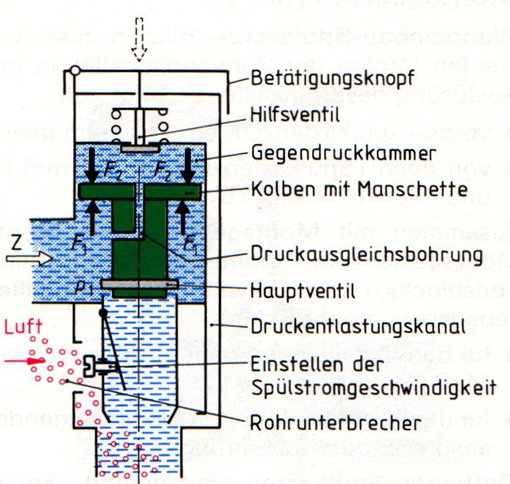 Der nun höhere Druck in der Zuleitung schiebt den Ventilkörper in die Gegendruckkammer. Das Hauptventil öffnet, Wasser fließt. Über den Druckausgleichskanal füllt sich die Gegendruckkammer. Das Hauptventil schließt rückschlagfrei. Mit der Reguliernadel wird der Hub des Hauptventils begrenzt und damit die Spüldauer eingestellt. Jede Bewegung des Ventilkörpers reinigt den Druckausgleichskanal.