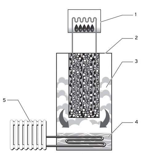 Das feuchte Zeolith wird indirekt über einen geräteinternen Wasserkreislauf, den Primärkreis (auch Zeolithkreis genannt), der vom Gas-Brennwertgerät (= Antriebsenergie) beheizt wird, erhitzt. Das im Zeolith gespeicherte Wasser verdampft. Der Wasserdampf strömt nach unten und kondensiert an einem Wärmetauscher, der die Kondensationswärme direkt in den Heizkreis eingespeist.