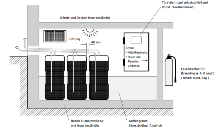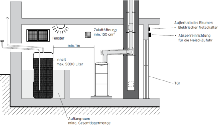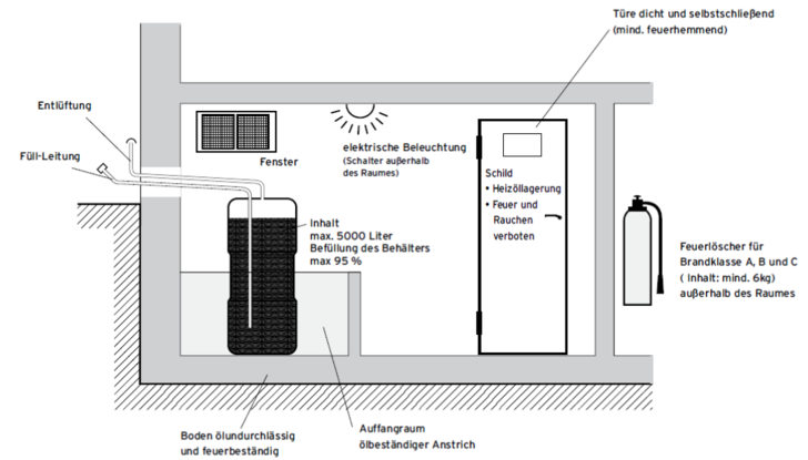 Werden mehr als 5.000 l Heizöl in Gebäuden gelagert, so ist ein besonderer Raum ohne Feuerstätten (Heizöllagerraum) erforderlich. Er